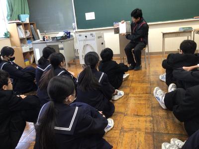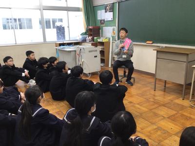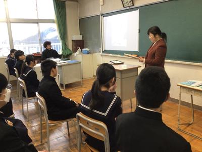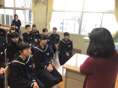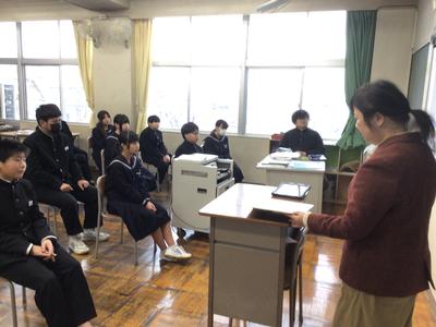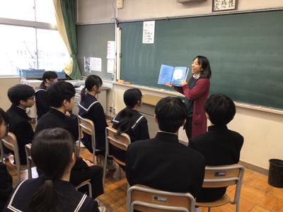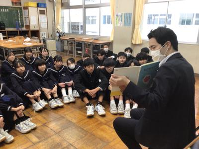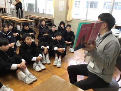 絵本の読み聞かせの様子です。5人の先生方が絵本を読んでいました。生徒は食い入るように見つめており、中学生も読み聞かせが好きなんだと改めて思いました。