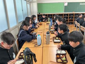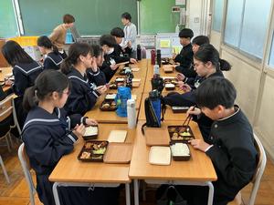 教室で食べるランチボックスです。美味しそうなおかずが並んでいて、みんな嬉しそうです。