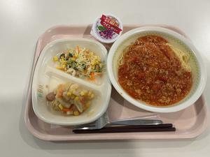 ランチルームでスクールランチを食べています。1年生は今日はBメニューでミートスパゲティです。