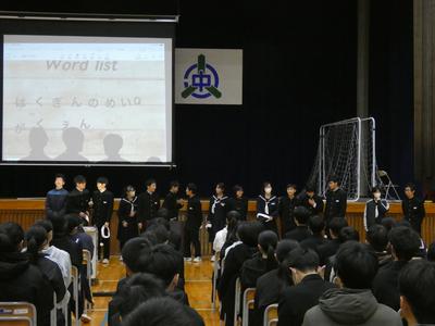 体育館に集まってクラスごとのキーワードを集めると、全校で1つの文「はくぎんのめいQがくえん」が完成しました!