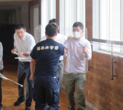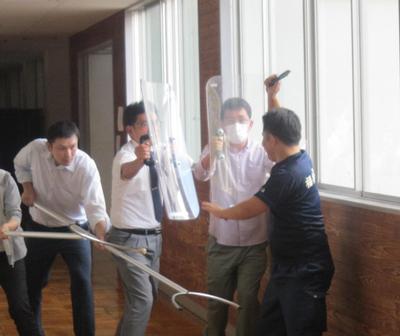 「不審者」が保護者を名乗って職員玄関から侵入した想定で、職員らが盾やさすまたで「不審者」を取り押さえたり、警察へ通報したりする訓練でした。
