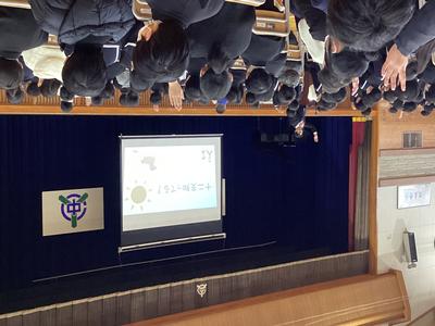 校長先生からは、よく知られている十二支(じゅうにし)に加え、十干(じっかん)についても紹介され、十干と十二支の組み合わせで60通りの「干支(えと)」となるお話がありました。今年は60年に一度の「丙午(ひのえうま)」の年。「行動力が高まる年」と言われているそうです。さらなる成長を目指して、新たな挑戦ができる年になるといいですね。