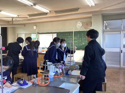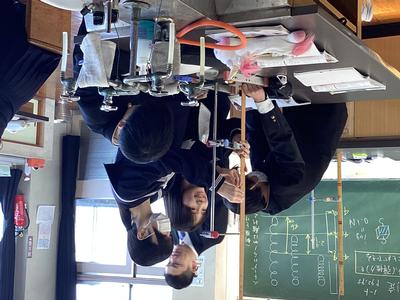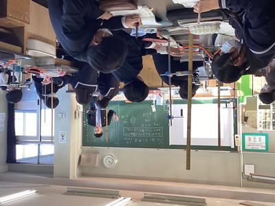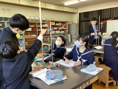 1年生の理科の授業では、ばねがおよぼす力(弾性力)について学習しました。ばねにおもりをぶら下げ、ばねの伸びを測定してグラフに表す活動です。グループごとに協力しながら、ぶら下げるおもりの個数を増やしたときのばねの伸びについて調べることができました。