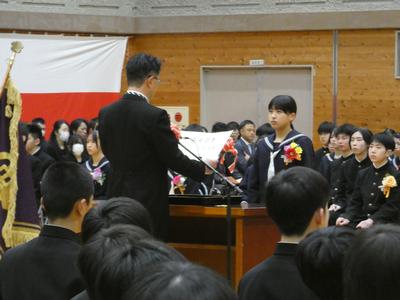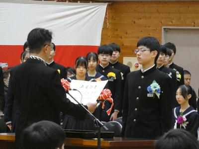 担任から一人一人名前を呼ばれると大きな声で返事をし、各クラスの代表者が校長から卒業証書を授与されました。