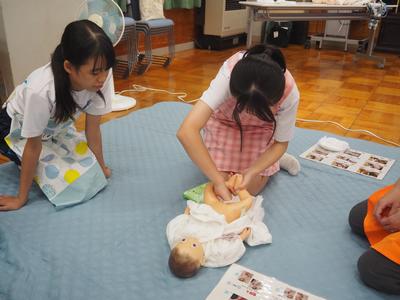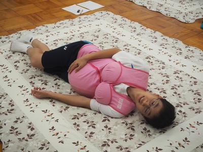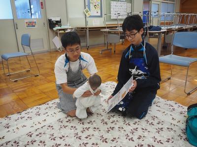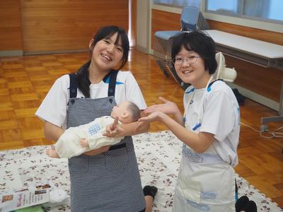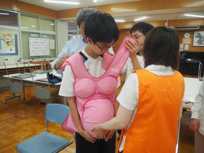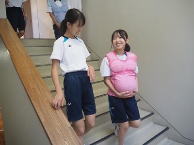 10月10日(金)5・6限目に妊婦・育児体験を行いました。妊婦体験では、約7キロある妊婦ジャケットを着て、寝たり起きたりする、靴下を履く、階段を昇り降りするなどの動作を行いました。生徒たちは、お腹の中に赤ちゃんがいることを想定して、お腹に負担がかからないようにするにはどうしたらいいのか考えながら体験し、妊婦さんの大変さを実感することができたようでした。また、育児体験では、赤ちゃん人形を使って縦抱き・横抱き、オムツ替えの方法を学びました。実際の赤ちゃんに接するように優しく声を掛け、抱っこやオムツ替えのポイントを確認しながら体験していました。11月6日(木)は、赤ちゃん抱っこ体験の本番です。本番が待ち遠しいですね!
