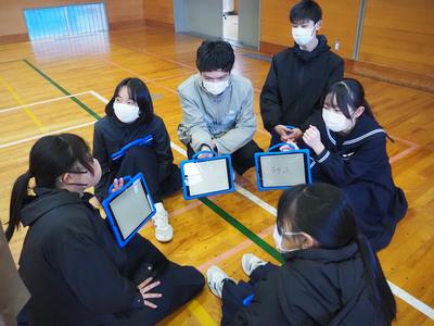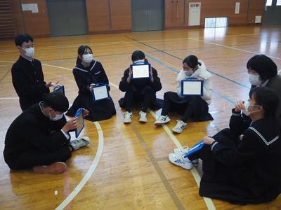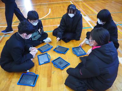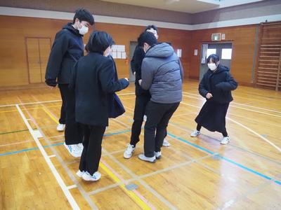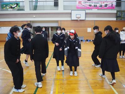 12月12日(金)6校時に、体育館で生徒会主催によるジョイフル五中が行われました。生徒会長のあいさつの後、グループに分かれて9マス鬼ごっこをしました。生徒たちは、マスで区切られたエリアの中で、鬼と同じマスに入らないよう逃げ回りました。また、最後のゲームでは鬼が二人に増え、協力して捕まえようとする鬼との駆け引きが盛り上がりました。その後、ジャストワンゲームをしました。チームのメンバーがお題を聞き、解答者にヒントを伝えてお題を答えさせるゲームです。チーム内で二人以上が出したヒントは、解答者に見せることができません。そのため、生徒たちは悪戦苦闘しながら、わかりやすくかつ他のメンバーとかぶらないヒントを考えていました。解答者は、限られたヒントからお題を導き出し、正解した時はチーム全員で喜びを分かち合いました。2学期も終わりに近づき、全学年で交流できる機会が残りわずかとなる中、笑顔があふれる1時間となりました。