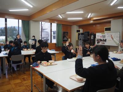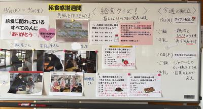 12/15(月)~12/19(金)は、食べることや給食に関わる人たちに改めて感謝することを目的とした給食感謝週間でした。給食時に保健・給食委員会の生徒が給食クイズを出したり、全校生徒から調理員さんたちへ感謝の気持ちを込めた色紙を渡したりしました。栄養職員の先生からは、献立や福井県に関する食べ物の話をお聞きしました。生徒たちは、毎日の給食にはたくさんの方々が関わって下さっていることを再認識し、その方々への感謝の気持ちをもつことができました。これからも、おいしい給食を味わっていただきましょう!
