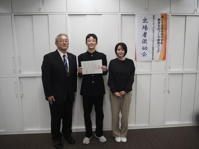 激励会では、開会宣言、出場者紹介、激励費交付がありました。そして、越前市教育長から「越前市の代表が全国大会に出場するというのは、越前市として大変うれしいです。大会でも全力を発揮してください。」と激励の言葉をいただきました。大会への抱負では、「全国大会では力を発揮し、全国の舞台を楽しんできます。」と述べ、持参したロボットでアイテムをポケットにのせる様子などを披露しました。見ている方にいろいろな工夫点も紹介し、「いいものを見せてもらった。」などお褒めの言葉をいただきました。全国大会でも持てる力を存分に発揮し、全国の舞台を楽しんでほしいと思います。頑張れ!やーまンポテト!