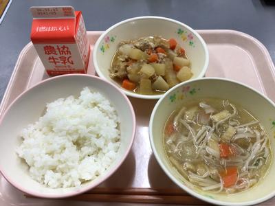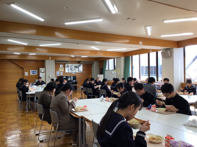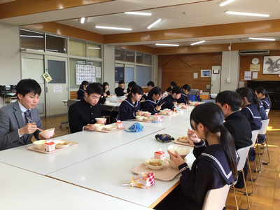 「コウノトリ米」は無農薬、無化学肥料で、生き物との共生を目指す「コウノトリを呼び戻す農法」により栽培されています。色つやが良くもちもちした食感で、生徒たちは「おいしい!」と言いながら味わって食べていました。また、今日の給食で使われていた大根やみそも白山小学校で作ったものでした。
