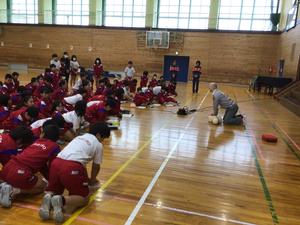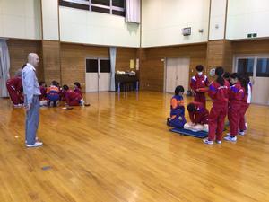 2~4時間目は、各クラスごとに、心肺蘇生人形やAEDを使用しながら救命実技を行いました。消防署や消防団の方々にご指導を