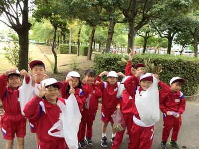 遊んだ後は、みんなで遊んだ落ち葉や木の実を片付けて、公園をぴかぴかにして帰りました。