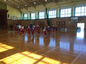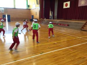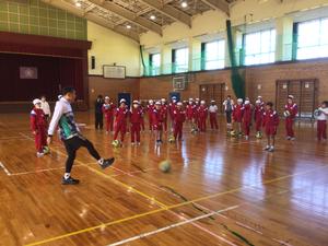 はじめに、体育館で鬼ごっこやサッカーをしました。ドリブルやキックのコツなどを分かりやすく教えていただい